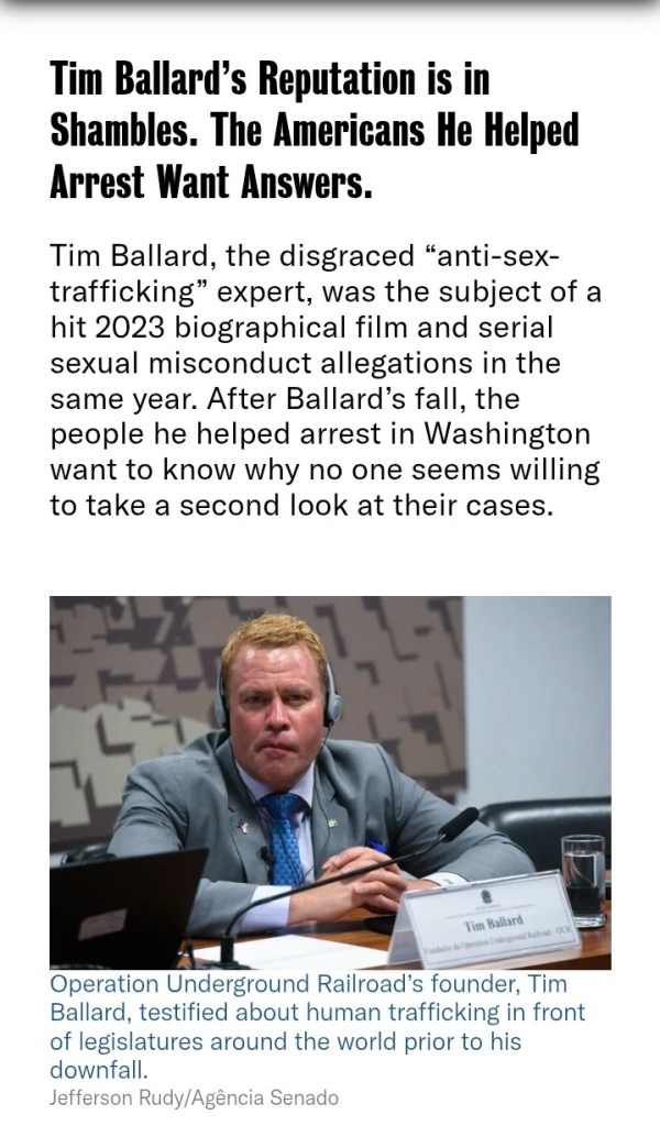Tim Ballard’s Reputation is in Shambles. The Americans He Helped Arrest Want Answers. Tim Ballard, the disgraced “anti-sex-trafficking” expert, was the subject of a hit 2023 biographical film and serial sexual misconduct allegations in the same year. After Ballard’s fall, the people he helped arrest in Washington want to know why no one seems willing to take a second look at their cases.